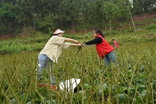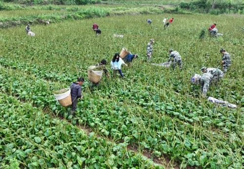 5月9日,内江市东兴区高梁镇方家沟村,党员、干部、民兵、志愿者正在采收车前子。