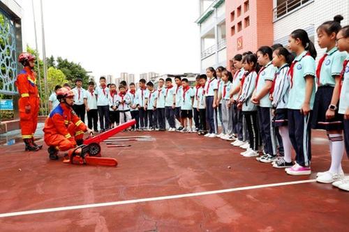 8月30日,广安市广安区长乐小学校园,广安区消防救援大队消防员在向学生讲解森林防火灭火器具使用常识。