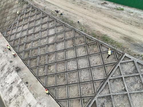 5月22日,记者在位于青神县高台镇女儿渡堤防工程的施工现场看到,洒水车在大堤上来回穿梭,工人们正在对马道以上框格梁护坡进行施工,机器轰鸣声和钢材敲击声此起彼伏,施工现场一派忙碌的景象。