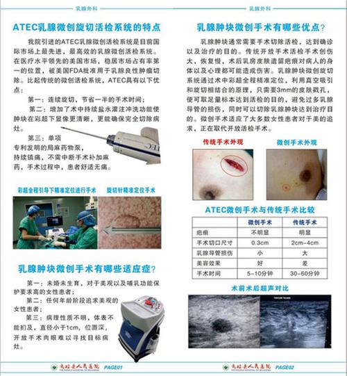 超声引导的乳腺微创旋切手术是在高分辨率声像图上可视性进行,具有诸多优点,符合医学美学要求:精确定位,准确切除病灶;切口微小,治疗效果、美容效果好;高科技设计安全性好,并发症少;诊断更准确;感染率低、更经济;手术快速、方便,无需住院,即做即走,术后即可自由活动。