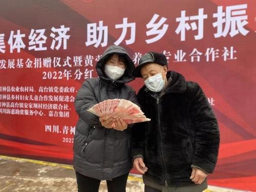 12月27日,在眉山市青神县高台镇玉蟾寺村村委会,由青神县农业农村局、高台镇党委政府和县妇联主办的“壮大集体经济 助力乡村振兴 村集体发展基金捐赠仪式暨黄莺岭村养殖专业合作社2022年分红大会”热闹举行,现场喜气洋洋,农民欢笑连连,村民们拿着刚领到的分红款,止不住开心地挥舞着手上的现金。