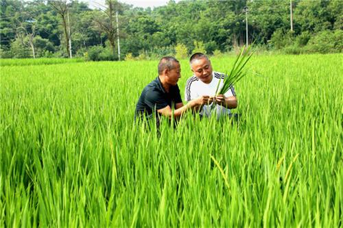7月6日,在眉山市仁寿县珠嘉镇三溪社区12组的稻田边上,三溪社区党委书记辜志勇和群众一起,正在查看水稻长势。