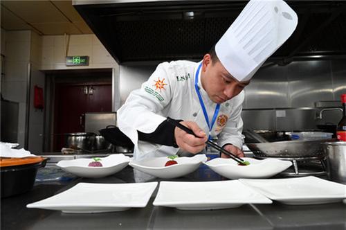 12月26日,内江市东兴区烹饪技能比赛现场,参赛选手在展示厨艺。