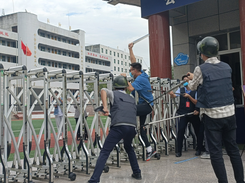 演练伊始,学校正校门门口正是学生入校高峰,一名“歹徒”手持利刃假借学生家长之名寻找学生,强行闯入,被护校队员阻拦,保安人员发现情况第一时间启动学校一键报警系统并报告安监处。2名保安人员手持防暴盾牌、钢叉上前阻止,与“歹徒”周旋,在护校队员的配合下,成功将“歹徒”控制并带离。
