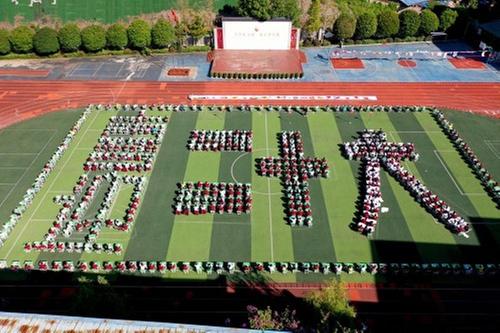 10月11日下午,广安市广安区东方小学操场,该校学生坐成“喜迎二十大”图形参加千人书法大赛,书写健康向上的喜迎党的二十大主题内容或古诗词。