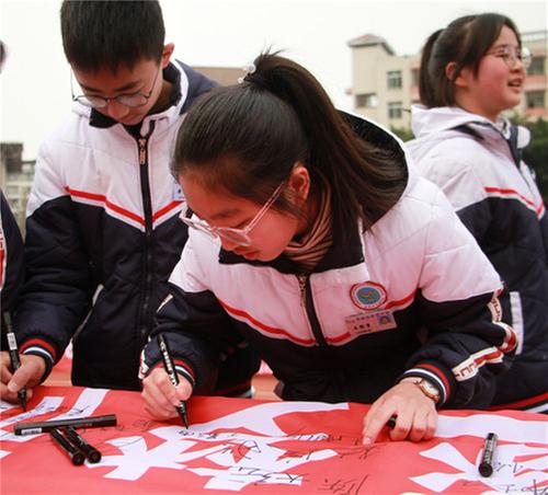 大会在雄壮的国歌声中开始,首先由初三优秀学生代表吴嘉馨同学向全体初三学生发出“奋战百日 感恩母校”的倡议;随后,各学科备课组长纷纷发言,表达了所有初三教师将与学生并肩战斗,为学生保驾护航并甘当人梯的衷心;接着,所有班级都进行了个性化宣誓,虽然形式内容各有千秋,但只争朝夕、奋战百日、信心满怀、斗志昂扬、感恩老师、为校争光、报答父母是所有同学的共同心愿;最后,总党支书记、校长吴文军勉励全体初三学子,要用热情去学,用激情去拼,用豪情去争,决战中考100天,再创学校新辉煌!誓师大会在同学们洋溢的激情和满满的自信中落下帷幕!