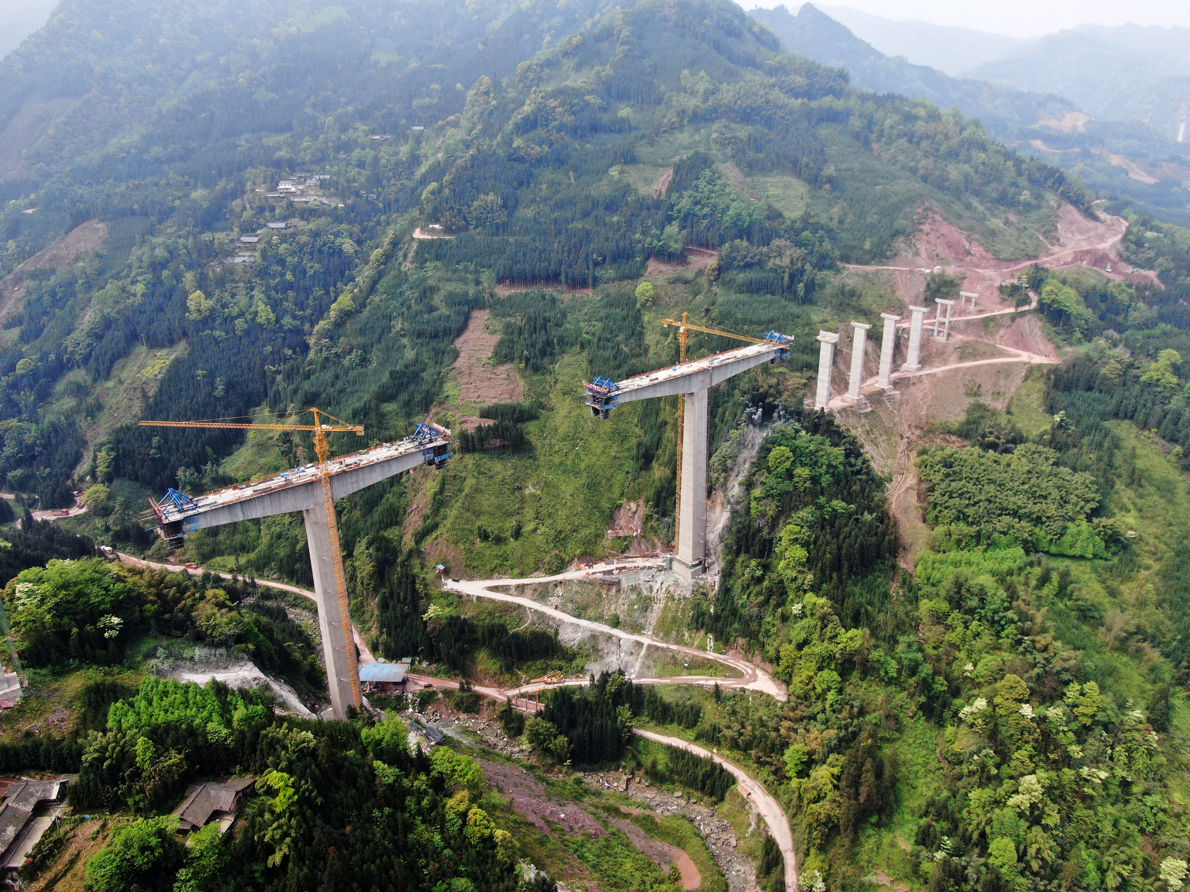 4月9日,航拍镜头下的四川省重点交通建设项目、眉山市洪雅县瓦屋山快速通道项目正在加快建设,其节点性工程之一的赵河村段麻柳坪特大桥五号、六号主墩高高耸立在两山之间,塔吊机忙着吊装作业,工人在进行着桥梁面施工。