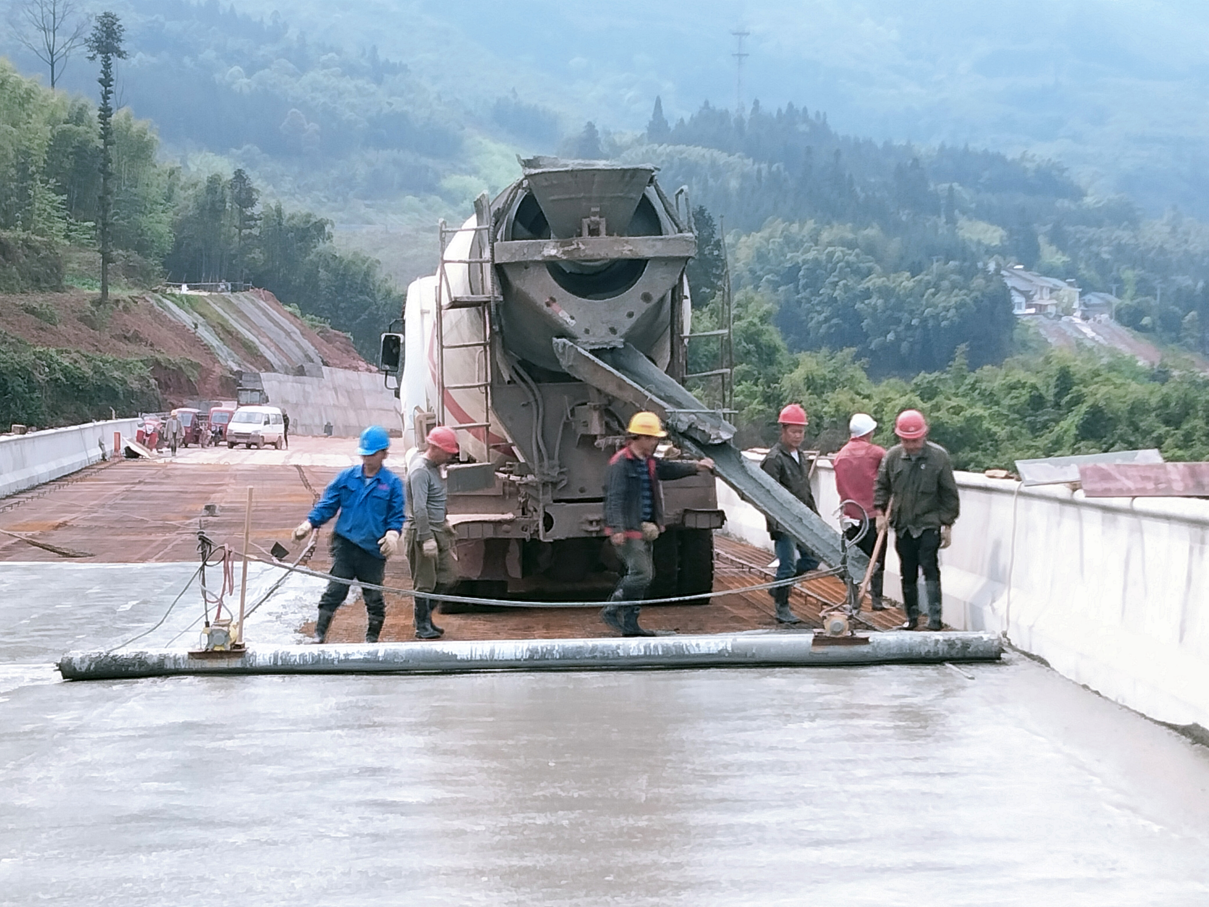 与此同时,在瓦屋山快速通道项目起点段施工现场,工们正在进行桥面混凝土浇筑、养护及其它附属工程施工。