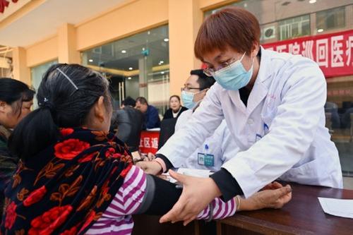 4月25日,内江市东兴区杨家镇团结社区,医护人员为赶集群众免费看病。