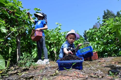 连日来,随着气温的持续升高,以内江市东兴区双桥镇为中心的万亩果桑产业园桑葚飘香,鲜果陆续成熟进入采摘期,当地和周边城市居民在品尝桑葚鲜果、入园采摘、打卡游玩和亲近大自然中尽情体验采摘乐趣,感受甜甜蜜蜜的田园生活。