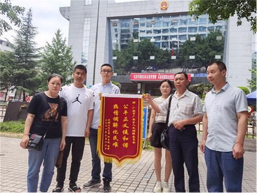 次日,死者家属将一面题有"公平正义促和谐,热情调解化民难"的锦旗送到广安区人民调解委员会调解员的手中,为广安区人民调解委员会的调解员热情服务竖起了大拇指。