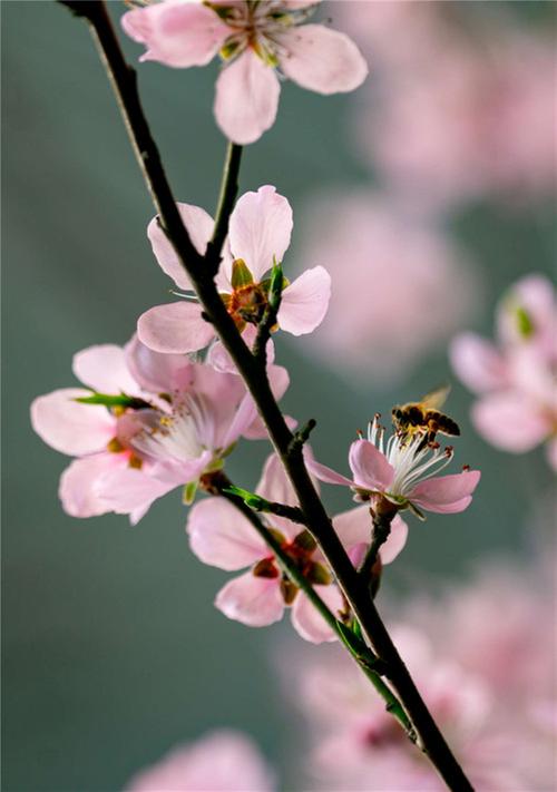 祠内的花儿似乎格外喜水,身子总是朝水面倾倒。瞧那粉白海棠几乎要贴近了水面,一朵朵花朵也朝着水面绽放,不知是在照镜子爱美呢,还是想与池水来个亲密接触。还有那消寒馆里的桃花,同样倾倒,不论远看还是近瞅,总似假花,她绽放地实在是太完美,那一抹桃红,不深不浅,恰到好处,每一枚花朵均匀等大,优雅地缀在枝头。微风轻拂,三两花瓣悠然落下,悄然击碎了真假的臆想。