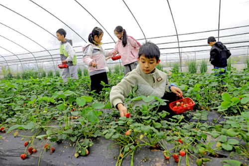 图为:学生采摘草莓。