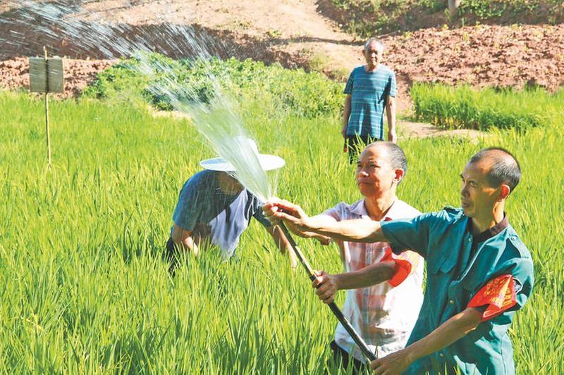 9月17日,泸州市纳溪区永宁街道党员助农服务队在给安富村村民的再生稻浇水。