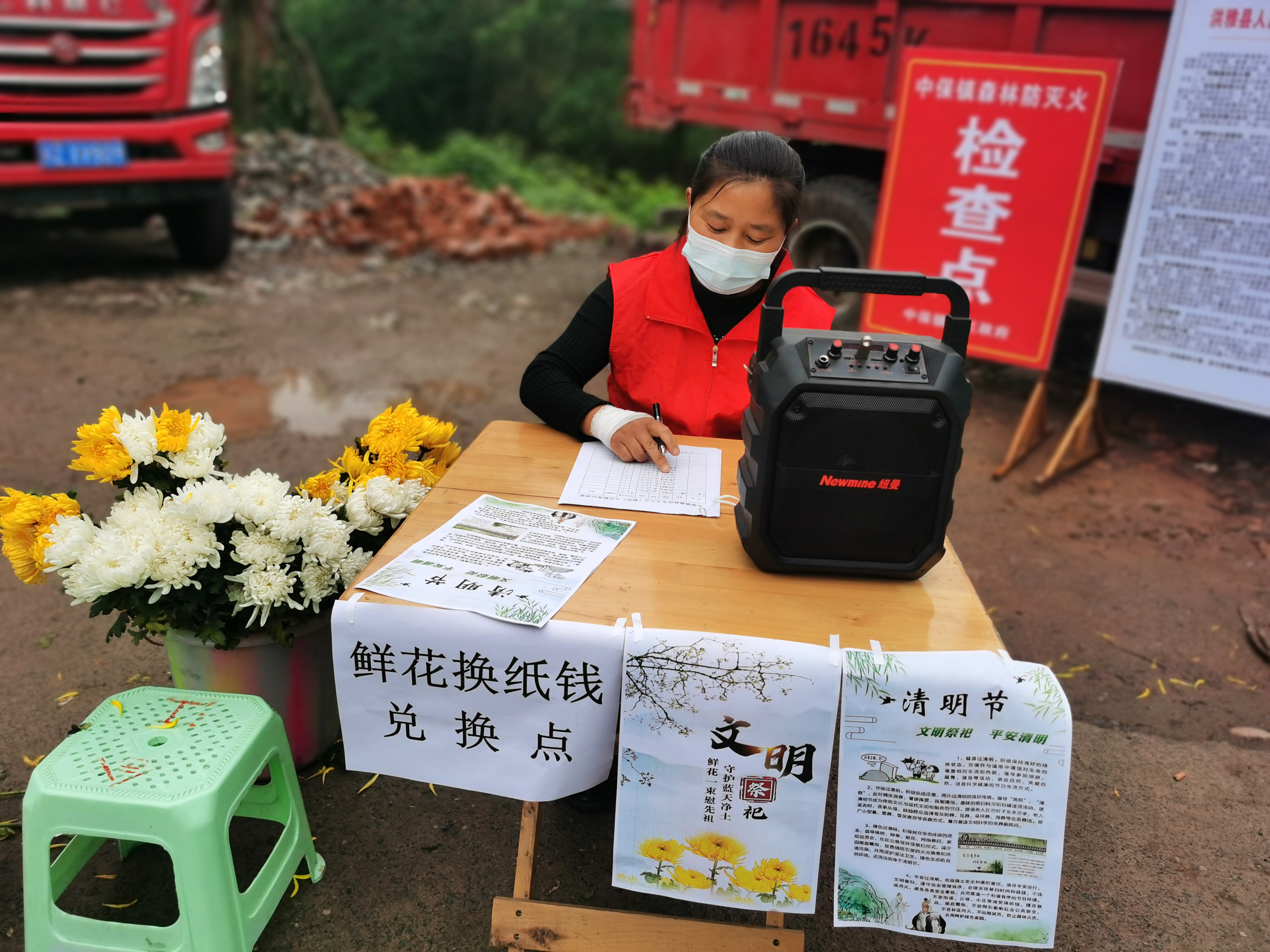 记者看到,在该镇各主要进山路口均摆放着鲜花、设置卡点,工作人员有序开展“鲜花换纸钱”活动。同时,卡点上的小喇叭播放着森林防灭火知识。