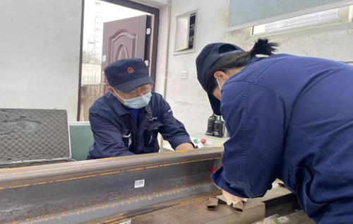 今年国庆假期期间,魏继洪也一直坚守在岗位上。魏继洪所在的工位是焊轨车间长钢轨焊接的第一道重要关卡——焊前检查,又称为“选轨”,主要是对百米“原材料”钢轨表面质量、型式尺寸等进行检查,从而为后续的长轨焊接作业顺利开展提供基础保障。只见魏继洪正使用钢轨检测样板尺和平直尺等专用测量工具,依次测量着钢轨母材的外形尺寸和平尺度等,娴熟的操作忙而不乱。