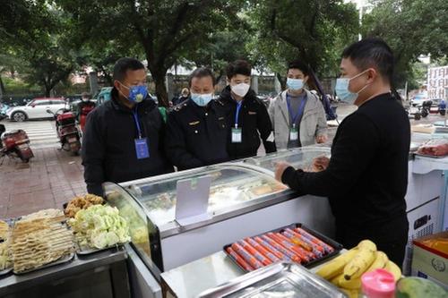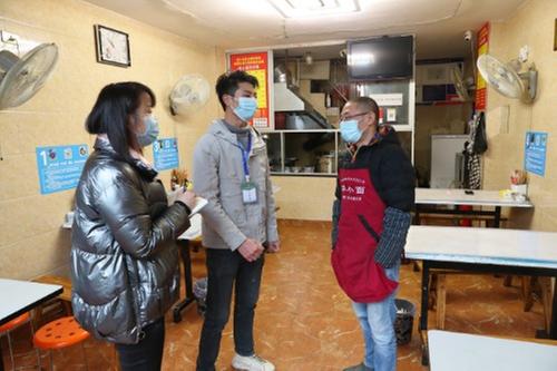11月30日,在广安市广安区北辰街道洗脚溪社区广安二中校门口一餐馆,该社区的食品安全社会监督员和志愿者在向经营业主宣传食品安全法律法规,指出经营中存在的食品安全问题。