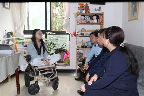 广安区残联、广安区教科体局干部正在与下肢瘫痪的折翼天使蒋婕会商上大学事宜,助其圆大学梦。